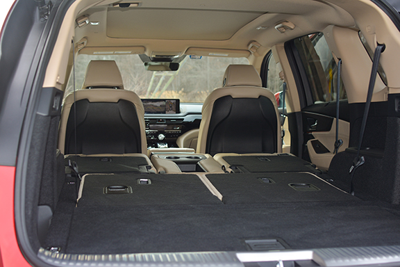 Second-row passengers will enjoy adjustable heated seats, although they don’t have power adjustments. There are no infotainment screens, but most people are happy to bring their own devices on a trip, anyway. A panoramic moonroof makes the space feel more open. You can fold the center seat down or completely remove it to leave two captain’s chairs. The third-row seats are best suited for children, though small adults could occupy them in a pinch. Treat them as a set of jump seats to use infrequently and you won’t be disappointed. If you choose to fold the third-row seats down, you’ll have a large cargo area without sacrificing the second row.