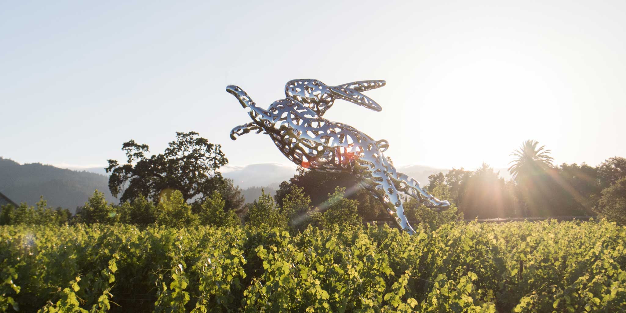 As you turn into the driveway at the Hall winery in St. Helena at the northern end of California’s verdant Napa Valley, an extraordinary sight pops into view: an exuberantly leaping, 35-foot-tall rabbit sculpted in shiny stainless steel. The rabbit, by artist Lawrence Argent, not only highlights the personalities of vintners Craig and Kathryn Hall but is the opening salvo in a cornucopia of interesting art that graces the public and private spaces of their properties. (The rabbit is also a subtle dig at wine-making conventions. Kathryn, who grew up loving Little Bunny Foo Foo stories, loathes the practice of killing grapevine-grubbing rabbits and put a halt to that.)