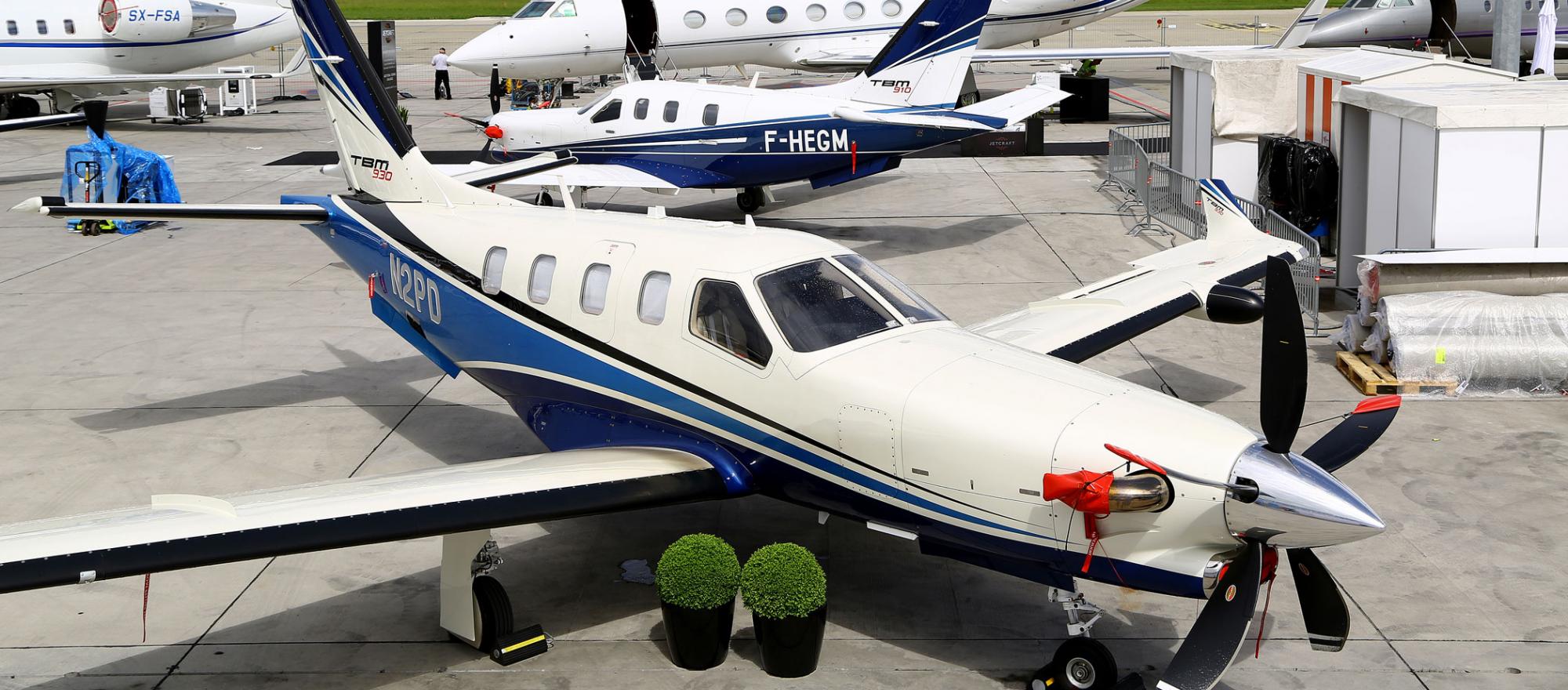The Daher TBM 930 (foreground) and 910 on the static display in Geneva at EBACE 2018