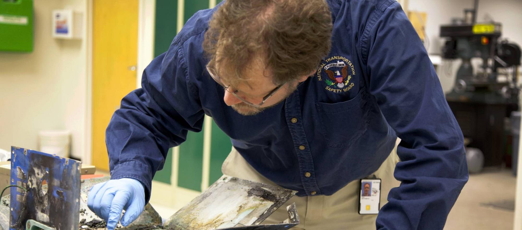 An NTSB investigator examines aircraft wreckage in a laboratory. (Photo: NTSB)