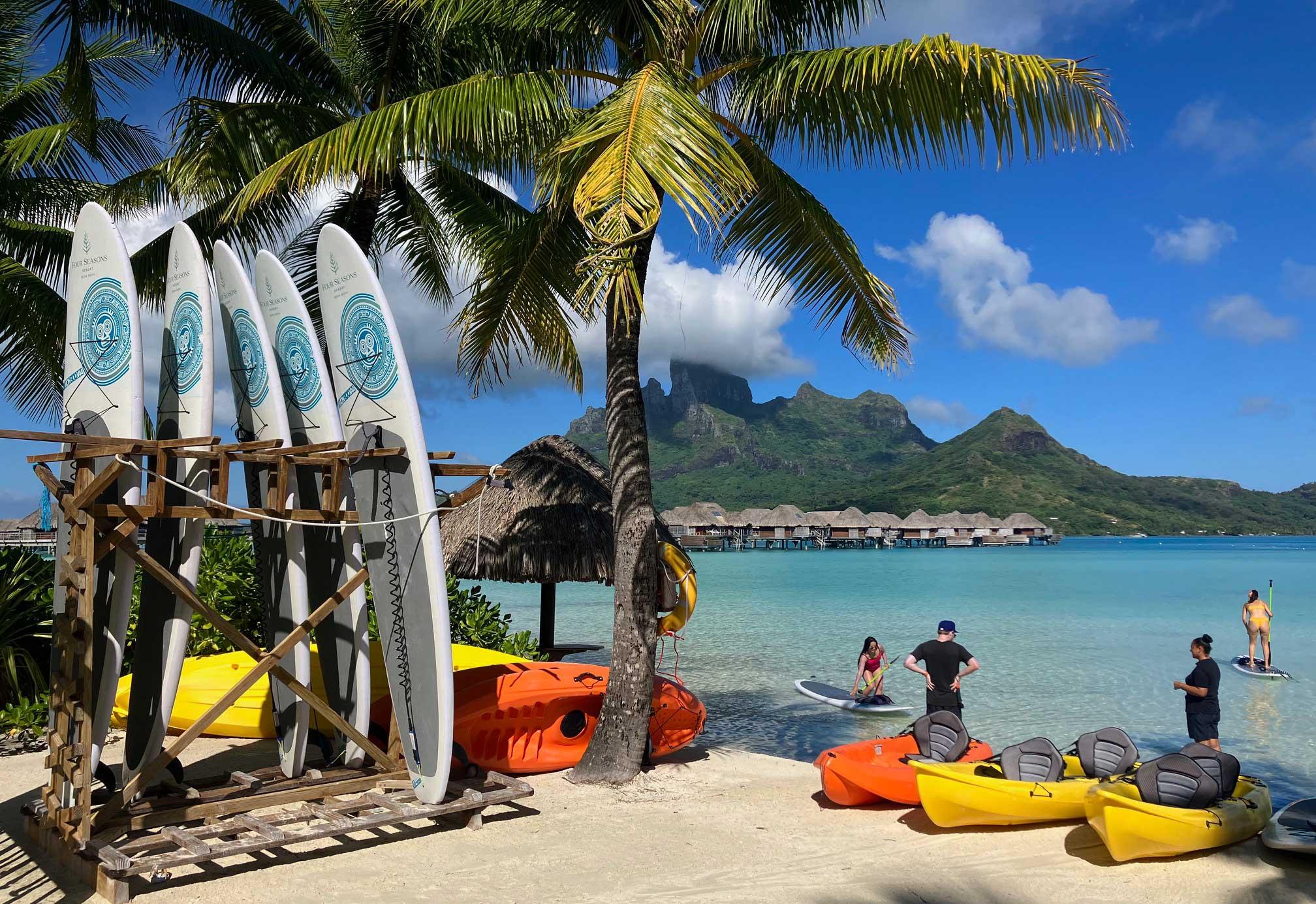 But what do you do at an overwater resort in Bora Bora? (Most of the resorts also offer land-based beachfront accommodations as well.) You wake up, throw on a swimsuit, and jump into some of the clearest, caressing waters anywhere, to swim among needlefish and colorful parrotfish. Expect a bountiful buffet breakfast featuring all kinds of croissants (these are French islands, after all) and other pastries and breads, fresh fish including the ubiquitous poisson cru (a Polynesian type of ceviche), fruits, cereals, Asian items, and traditional American dishes cooked to order. Then it’s time for kayaking, standup paddleboarding, and luxuriating (or vigorous lap swimming) in the pool or lagoon. The more adventurous should consider excursions where you get to feed stingrays and black-tipped sharks.