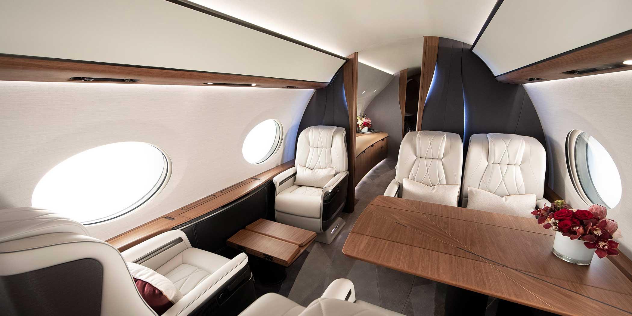 Gulfstream is building in a variety of other comfort-enhancing features on the G700: an intricate cabin lighting system with 20,000 HD LEDs that simulates sunrise and sunset and can be used to adjust human body circadian rhythms, a 100 percent fresh-air system, a maximum cabin altitude of 4,850 feet (while the aircraft is at 51,000 feet) and 20 oversized (21-by-28-inch) dimmable oval cabin windows for natural lighting—all working in concert to minimize jetlag.