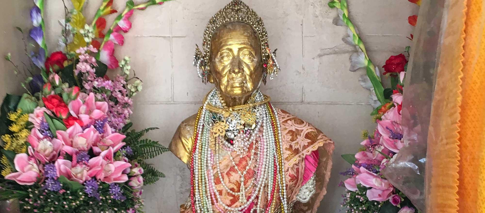 People still pay their respects to Grandmother Faeng. There is a gold-colored bust of the old woman in a small shrine behind the temple, where her shoulders are draped in lace and strings of plastic pearls have been placed around her neck. There is another statue of her in the viharn. She sits at the back, facing a collection of Buddha images, and is surrounded by offerings of flowers, draped with pink “pearl” necklaces and encircled by an assortment of make-up.