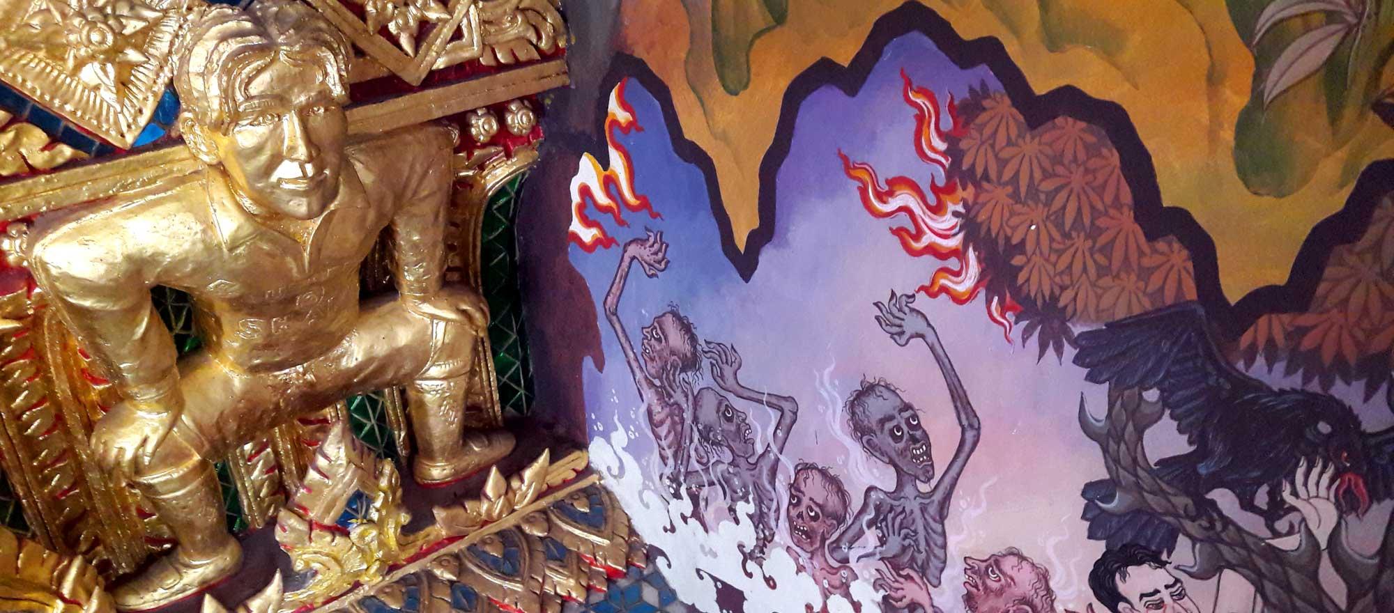 The main altar in the ordination hall at Wat Pariwat is decorated with a statue of David Beckham. It’s said that the abbot here removed a statue of Garuda (the giant bird of Buddhist mythology) to replace it with his Manchester United hero in 1998. The effigy, in Manchester United strip, crouches just inches from a bizarre mural, depicting scenes from hell in which starving figures are broiled alive while other naked “sinners” are pursued, bleeding up cactus trees by slavering dogs.