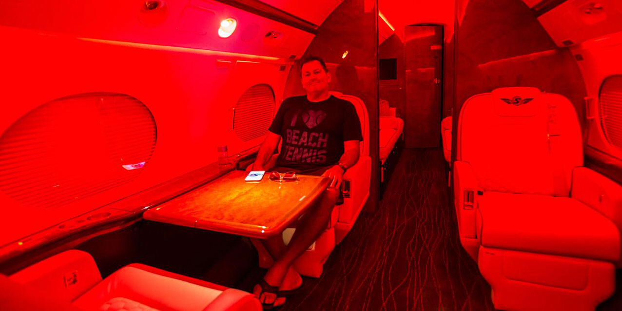 “The interior looks sporty,” Bonfigli adds, “but it has the comfort of a Bentley—a big touring car that you fall asleep in. You can’t help but feel good when you step onto the SEXYjet in the evening and there are glowing red lights, cream leather seating, and our theme song, Phil Collins’s ‘In the Air Tonight,’ is playing.”