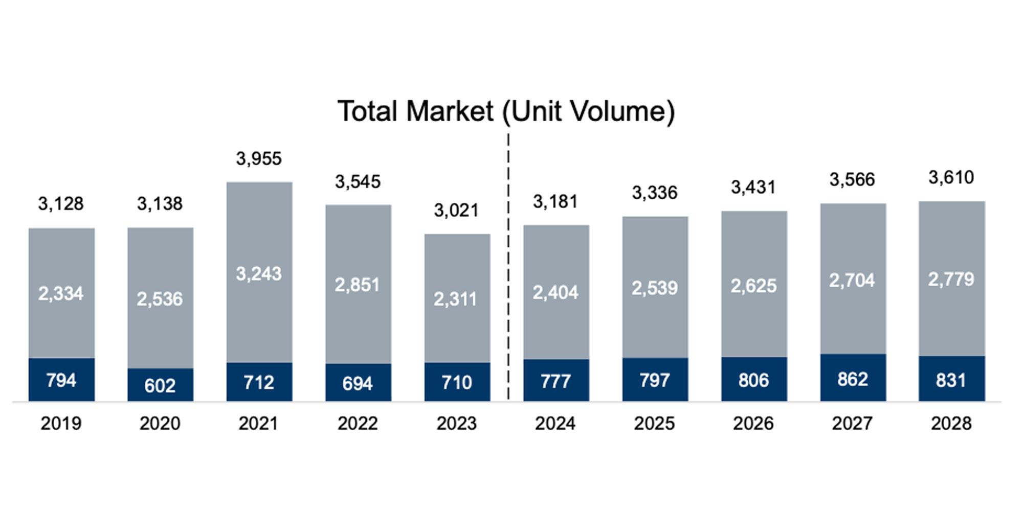 The business jet transaction market shrank in 2023 as OEMs continued to deal with supply chain and labor constraints and the pre-owned market continued to normalize from a historically strong 2021. Despite some headwinds in 2024, the business jet market remains resilient, and we forecast steady growth over the next five years.