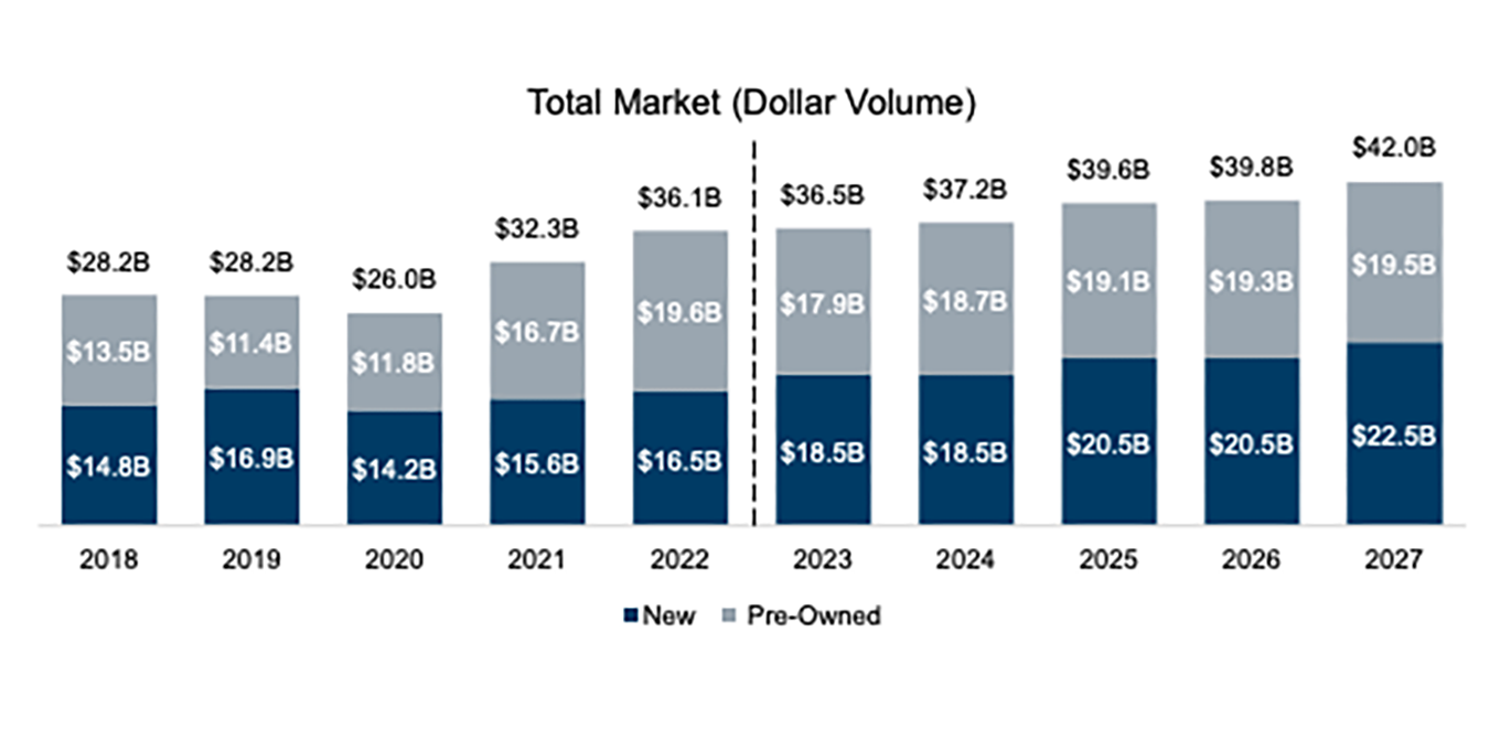 • Pre-owned transactions are expected to continue declining in 2023 as they did in 2022. Unit volume is forecast to decline 4.8 percent while dollar volume is forecast to decline 8.5 percent. Continued market demand, however, should lead to more pre-owned deliveries over the next five years. Pre-owned transactions are expected to increase at a CAGR of 2.5 percent, with dollar volume remaining stable over that time.